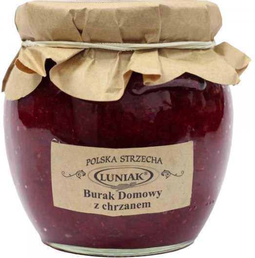 burak przetarty 80 %, chrzan przetarty 15 %, ocet spirytusowy, cukier, woda, sól.