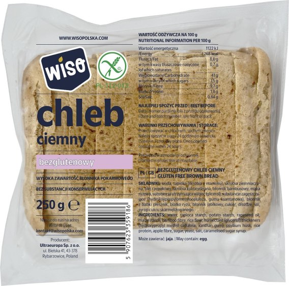 CHLEB CIEMNY KROJONY BEZGLUTENOWY 250 g - WISO