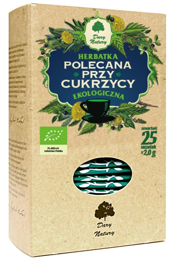 borówka czernica liść*, brzoza liść*, cykoria korzeń*, tawuła ziele*, rutwica ziele*, naowocnia fasoli*, mniszek kwiat*, mniszek korzeń*, szałwia liść*, melisa liść*, kocanka kwiat*. (w zmiennych proporcjach) (*certyfikowany składnik ekologiczny)