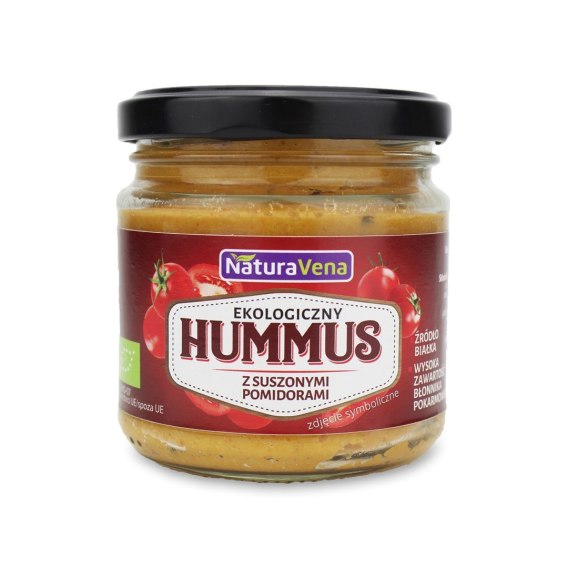 gotowana ciecierzyca* 54 %, (ciecierzyca*, woda), woda, przecier pomidorowy* 12 %, olej słonecznikowy*, suszone pomidory* 6 %, tahini* (łuskane, mielone NASIONA SEZAMU*), ocet jabłkowy*, sól morska, czosnek suszony*, papryka mielona słodka*, pieprz czarny*, oregano* (*certyfikowany składnik ekologiczny).